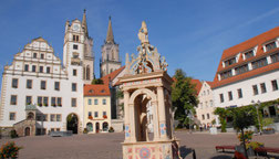 Ein imposantes Ensemble mit Brunnen, Rathaus und im Hintergrund die doppeltürmige St.-Aegidien-Kirche, macht den Neumarkt von Oschatz zu einem der schönsten Marktplätze in Sachsen.
